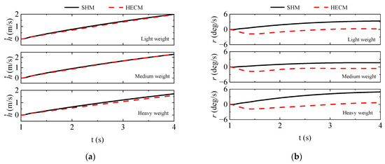 The handling quality of the helicopter’s collective–yaw coupling characteristics under different weights and forward speeds is shown in Figure 16. The engine’s dynamic characteristics contribute to the helicopter’s collective–yaw coupling HQR deterioration. The collective–yaw coupling HQR decreases to Level 2 as the flight weight increases. The impact of engine output lag on increases from −0.148 to −0.785. Conversely, the impact on decreases from 0.007 to −0.216. The lag in engine output torque alters the direction of the yaw rate , leading to a change in the sign of yaw rate changes, further exacerbating the adverse impact on the collective–yaw coupling characteristics.