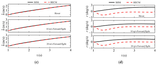 The response results in Figure 15 depict a pronounced reverse process in the dynamic response of the yaw rate after the introduction of the engine model. This phenomenon can be attributed to the torque mismatch between the rotor and tail rotor on the yaw axis of the helicopter. When the collective signal is input, the engine output lag causes the torque imbalance on the rotor axis, leading to the helicopter’s reverse yaw motion.