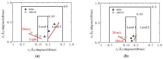 From an energy perspective, when the rotor speed changes, the kinetic energy stored in the rotor is converted into the helicopter’s translational kinetic energy, compensating for the impact of insufficient engine power. As flight weight increases, rotor thrust also increases, and the duration of speed fluctuations resulting from engine output power becomes longer and exacerbates the adverse effects on rotor thrust, reducing the helicopter’s altitude response handling quality. From an energy standpoint, as flight weight increases, the kinetic energy stored in rotor rotation becomes relatively insufficient, resulting in a more pronounced reduction in rotor speed under the same control input. Consequently, the helicopter’s altitude response handling quality rating experiences a significant decline with increasing flight weight.