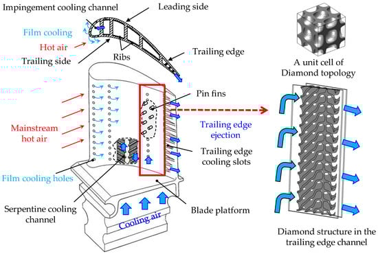 Sketch of a modern gas turbine blade [8]; also shown is the Diamond-type TPMS structure design for the trailing edge cooling channel.