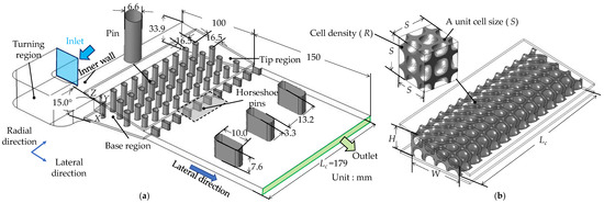 Based on the geometrical configurations of the trailing edge of the gas turbine blade, the numerical model is designed as a wedge-shaped channel equipped with the pin fin and Diamond structures, as depicted in Figure 2. The dimensions of the wedge-shaped model in this research corresponded to the experimental wedge-shaped model examined by Liang et al. [26], including the fluid and solid domains. The fluid domain comprises an inlet, a turning region, a channel in a wedged shape, and an outlet. The inlet hydraulic diameter (Dh) is 33.9 mm. The length in the radial and lateral directions is 179 mm and 100 mm, respectively. The angle of the wedge-shaped channel is 15 deg. A row of horseshoe pin fin structures is placed at the outlet upstream. The length of the channel outlet is 150 mm to prevent backflow and ensure numerical stability [19,20,21].
