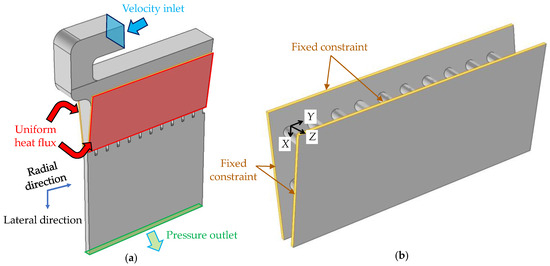 The solution of the linear elastic equation requires related solid mechanics boundary conditions. As the gas turbine blade trailing edge is only considered in this study, the boundary conditions are simplified from the previous investigations where the full gas turbine blade is considered [3,4]. Here, the fixed constraint boundary condition (displacement vector = 0) is applied on four surfaces to mimic the gas turbine blade trailing edge, as shown in Figure 3b [30]. Finally, all other boundaries on the solid domain are specified as a free boundary condition to allow the blade to deform freely due to thermal expansion.