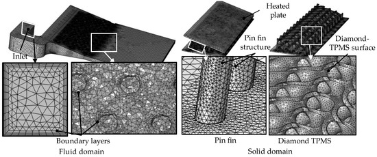 As the flow, heat transfer, and structure of the wedge-shaped models are simulated in COMSOL Multiphysics, the tetrahedron-shaped and prism-shaped grids are generated to discretize the fluid and solid domains. The grid systems of the pin fin and Diamond-sheet structures are shown in Figure 4. The prism-shaped boundary layer grids are finely created at all no-slip boundaries. The number of boundary layers is five, and the boundary layer stretching factor is 1.2. The thickness of the first layer is automatically selected by default with an adjustment factor of 2.5 [19,20].