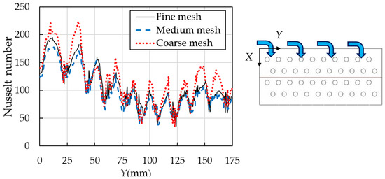 Three grid systems (coarse, medium, and fine) with the element numbers 1.06, 1.35, and 1.80 × 106 are generated for the baseline pin fin structure to examine the grid dependence. The Nusselt number (Nu) from these different grid systems is plotted to test the grid independence in Figure 5. The local Nusselt number (Nu) in the numerical simulations is calculated as follows: