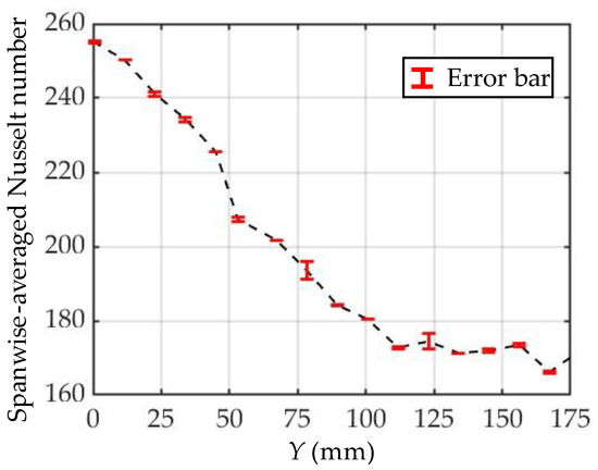 The grid convergence index method (GCI) was also employed in this numerical investigation, which has been used to report the uncertainty because of the discretization in many complex flow studies. The procedure can be surveyed in [32]. Figure 6 presents the GCI value using the spanwise-averaged Nusselt number on the endwall of the fluid domain. The line represents the finest mesh solutions, while the red bars signify the discretization errors. The maximum error is 2.4% at Y = 75 mm due to the large flow and temperature differences in the different mesh systems, whereas the mean error value is less than 1.0%. The grid number of 1.80 × 106 is adopted in the baseline pin fin structure, ensuring numerical accuracy. For the Diamond model, the grid system is created with setups similar to those in the baseline pin fin structure.