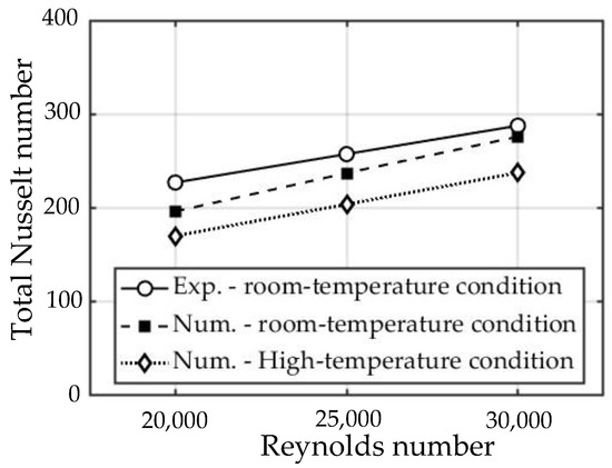 Figure 7 shows the Nutotal of the numerical results is lower than the experiments for both room and high temperatures. Here, the room-temperature condition represents the model calculated with the same experimental condition using the steady-state copper plate technique with a maximum temperature of around 323.15 K by Liang et al. [26]. The results show the maximum error deviates by about 13.6%, while the mean discrepancy is 8.5% for the room-temperature condition. Meanwhile, the error for the high-temperature condition is around 25–31.8%, compared to the experimental results. These high values are because the copper material provides superior thermo-physical properties than the nickel-based alloy, causing a difference in the heat transfer [19]. However, the overall trends of the present simulation are similar to that of the room-temperature condition.