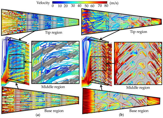 Overall flow structure characterized by the velocity streamlines for (a) baseline pin fin structure and (b) Diamond model at Re = 30,000.
