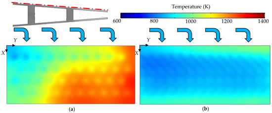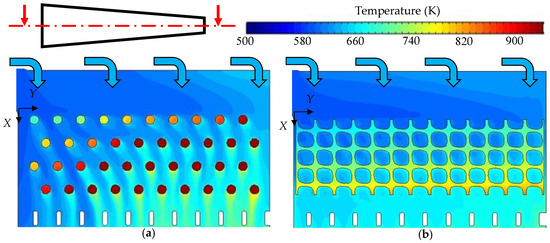 Furthermore, to observe the temperature gains from the hot flow mainstream, the temperature distribution on the external wall of the solid domain for (a) the baseline pin fin structure and (b) the Diamond model at Re = 30,000 is presented in Figure 13. It can be clearly seen the temperature in the Diamond model is much lower than in the baseline pin fin structure. The average temperature on the external wall in the Diamond model is reduced by 19.9% compared to the baseline pin fin structure. The low-temperature regions are attributed to the complex flow generated in the Diamond curved walls. Moreover, the temperature distributions in the Diamond model are much more uniform than in the baseline pin fin structure, mitigating the thermal failure of gas turbine blades under high operating temperature conditions.