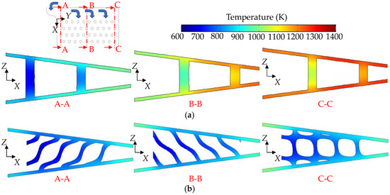 The temperature distribution in the solid domain from different Z-X cross-sections for (a) the baseline pin fin structure and (b) the Diamond model at Re = 30,000 is presented in Figure 12. The Diamond model causes lower temperatures than the baseline pin fin structure because the large, wetted areas of the Diamond curved walls exchange the heat better. The temperature distributions in the Diamond network are also uniform, reducing the thermal stress concentration due to high-temperature differences.