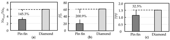 Comparisons of (a) total Nusselt number ratio, (b) friction factor ratio, and (c) thermal performance enhancement for the baseline pin fin structure and Diamond model at Re = 30,000.