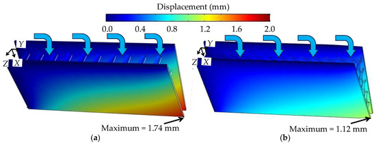 The displacement contour on the channel between the baseline pin fin and Diamond structures is demonstrated in Figure 15. The results of high temperature deform the blade because of thermal expansion. For both structures, the largest deformation is observed at the tip region near the channel outlet [30]. The maximum displacement in the baseline pin fin structure is 1.74 mm, while in the Diamond, the maximum value is 1.12 mm. The Diamond structure in the wedge-shaped channel helps reduce the volume displacement due to the material thermal expansion by about 29.3%, as compared to the baseline model. Furthermore, as the ceramic material can be used to additively manufacture complex structures via the PBF [2] in the future, the displacement and temperature distribution of the gas turbine blade can be further improved [3,4,5].
