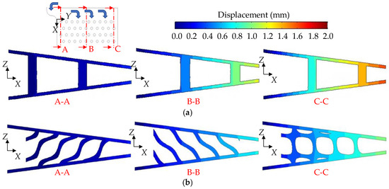 Figure 16 compares the displacement contour at Z-X different cross-sections on the wedge-shaped solid domain between the baseline pin fin and Diamond structures. Both cases cause a large displacement near the tip region. Due to the high-temperature gradient, the displacement also emerges in the pin fin elements and Diamond structures. Nonetheless, the displacement in the Diamond model is smaller and evenly distributed, as seen in plane C-C of Figure 16b. The uniform deformation in the Diamond model could reduce the sudden cracks on the trailing edge gas turbine blade.