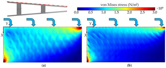 Figure 17 shows the contour of von Mises stress on the top plate for the baseline pin fin and Diamond models at Re = 30,000. Both cases expose similar stress patterns, where the highest stresses emerge at the fixed boundaries due to high-temperature differences between the fluid and solid domains, as seen in Figure 13. Here, the Diamond model causes smaller areas of high stress than the baseline pin fin structure. Also, the von Mises stress in the Diamond structure is distributed more evenly because of the interconnected network in the channel. The volume average of von Mises stress in the Diamond structure is reduced by 28.8% compared to that in the baseline pin fin model.
