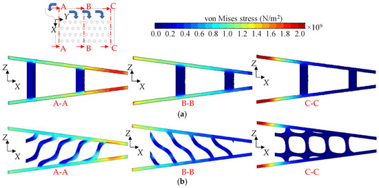 The comparison of von Mises stress distribution at the different Z-X cross-sections between the baseline pin fin and Diamond models at Re = 30,000 is shown in Figure 18. For the baseline pin fin structure, the areas of high stress are found on the plates, while for the Diamond model, the region of medium stress can also be observed on the Diamond curved walls. As the stress distributes on the Diamond networks, the thermal stress on the plates of the Diamond model is lower than that of the baseline pin fin model. This result significantly mitigates the thermal failure of the trailing edge gas turbine blade.