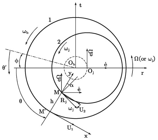 Figure 2 shows the rotating coordinate system and bearing motion; when the rotor rotates at speed ωj, the center Oj of the rotor journal has a precession extrusion velocity eΩ, where Ω is the instantaneous precession angular velocity, and under the steady synchronous condition, Ω = ωj. There is also radial extrusion velocity (e is eccentricity). Furthermore, the stator inner hole can rotate at the angular velocity ωb, and under such a condition, the trajectory of the rotor center Oj around the stator hole Ob will be unsteady with non-circular precession. Only when e is a constant and , the trajectory of Oj has circular precession.
