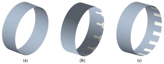This study will mainly analyze the flow field characteristics of the no-groove gas film model, T-groove gas film model, and straight-groove gas film model. The groove depth is 10 μm; for the two grooved models, the number of grooves is 16, and the dynamic pressure groove parameters are shown in Figure 4. Three types of gas film models are established based on the control variable method, which is shown in Figure 5.