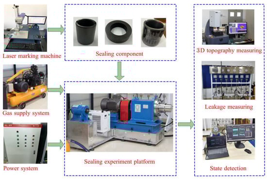 The CGFS experiment system includes a laser marking machine, a gas supply system, a power system, a sealing test rig, a state detection monitors system, a leakage measurement system, and a three-dimensional topography measuring instrument. The composition of the experiment system is shown in Figure 8. A laser marking machine is used to provide dynamic pressure grooves on the surface of moving rings. The gas supply system provides compressed gas and sends the gas into the sealing cavity through the pipeline. The power system provides power for the rotor of the sealing test rig. The three-dimensional morphology measuring instrument detects the quality of the dynamic pressure grooves and the surface roughness of the sealing component. The leakage measurement system measures the leakage at the outlet. The state detection system monitors real-time status parameters during the experiment, such as rotor rotational speed, inlet pressure, etc.