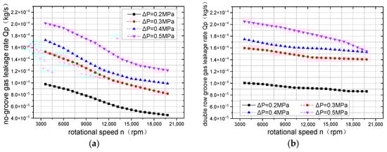 Figure 9 shows the leakage rates of two types of grooves under different pressure differential in experiments. In Figure 9a, when the pressure differential is 0.2 MPa and 0.3 MPa, the leakage rate of the no-groove gas film changes similarly, and it decreases with an increase in rotational speed. When the pressure differential is 0.4 MPa and 0.5 MPa, the leakage rates decrease with an increase in rotational speed. When the rotational speed exceeds 15,000 rpm, the leakage rate gradually stabilizes. In Figure 9b, when the pressure differential is 0.2 MPa, 0.3 MPa, and 0.4 MPa, the leakage rate slowly decreases with an increase in speed for the two double-row grooves. However, when the pressure differential is 0.5 MPa, the leakage rate rapidly decreases with an increase in rotational speed. Overall, the leakage rate of both grooves decreases with an increase in rotational speed. The larger the pressure differential, the greater the leakage.