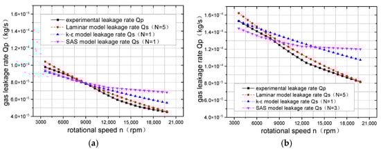 Figure 10 shows the leakage rate calculated using different mathematical models for the no-grooved dynamic ring gas film at pressure differentials of 0.2 MPa and 0.3 MPa. The leakage rate computed using a 5-layer grid and a LAMINAR calculation model is closest to the experimental value in Figure 5. For the standard k-ε model, although the model has fewer layers and lower computational costs, there is a significant difference between the numerical value and experimental data. The calculation results of the SAS model are consistent with the experimental value at speeds below 12,000 rpm; when the speed exceeds 12,000 rpm, the changing trend of leakage rate is opposite to the experimental value. Therefore, the SAS model is unsuitable for numerical analysis under this operating condition.