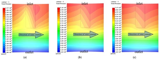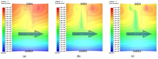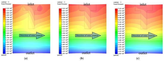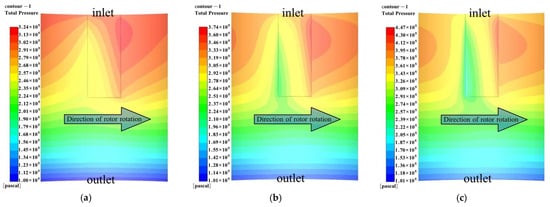 To study the characteristics of the gap flow field at different pressures, we set the rotational speed at 8000 rpm, the outlet pressure at 0.1 MPa, and the pressure differentials at 0.2 MPa, 0.4 MPa, and 0.6 MPa, respectively. Figure 14 shows the distribution of the straight groove cylindrical film pressure at different pressure differentials. The arrow in Figure 14a shows the rotation direction of the moving ring. As shown in Figure 14, the larger the pressure differential, the larger the area of the high-pressure zone.