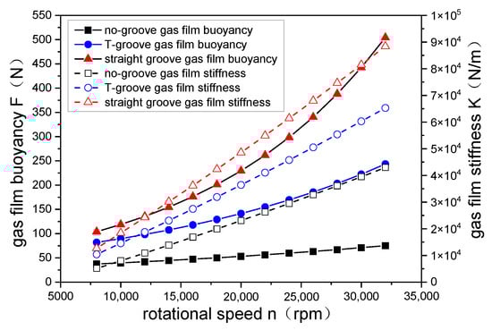 The change rule of gas film buoyancy and stiffness with rotational speed is shown in Figure 16, and the result shows that the gas film buoyancy of both groove models significantly increases when the rotational speed increases; this is because high rotational speed can bring more gas into the micro convergence gap, which increases the internal pressure of the gap and enhances the hydrodynamic effects. We can see that the gas film buoyancy generated by the straight groove is higher than the T-grooves. Due to the large inlet of the T-groove, when a large amount of gas is pumped into the gap, the gas pressure increases at the wing groove first, but the pressure is small. However, the channel of the straight groove is long, and when the gas moves to the bottom of the groove, the pressure increases due to the blockage of the dam area, and the gas pressure rapidly increases, so the gas film buoyancy increases, which is significantly higher than the T-groove. The gas film stiffness reflects the ability of the gas to resist deformation and maintain stability. As the rotational speed increases, the gas film-bearing capacity increases. So, the ability of the gas to resist external interference increases, and the gas film stiffness of the three models grows with an increase in rotational speed.