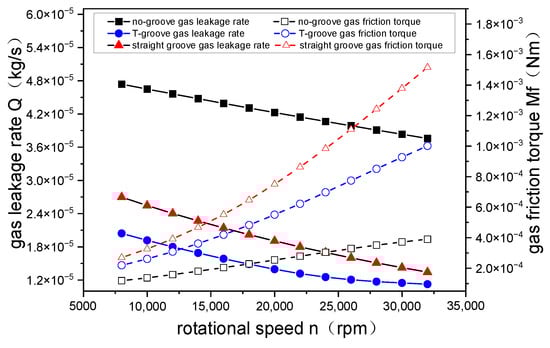 Figure 17 shows the change curve of gas leakage rate and gas friction torque with rotational speed for three types of grooves. The inlet pressure is 0.3 MPa, the outlet pressure is 0.1 MPa, and the pressure differential is 0.2 MPa. As the rotational speed increases, the leakage rate of the three types of gas film decreases with an increase in rotational speed. When the rotational speed increased from 8000 rpm to 32,000 rpm, the leakage rate of the straight groove decreased by about 50%, the leakage rate of the T-groove decreased by 45%, and the leakage rate of the no-groove gas film decreased by only 21%. It can also be seen that the leakage rate of the no-groove gas film was greater than that of the other two types of gas film. This indicates that the dynamic pressure groove can effectively reduce leakage rate; when the gas flows to the bottom of the dynamic pressure groove, it is blocked by the weir and dam, resulting in a significant reduction in axial leakage rate. The leakage rate of the grooved gas film is significantly smaller than that of the no-groove film. When the gas rotates at high speed, the macro-gas friction force is generated because of the Newtonian viscous shear force and the viscous force. However, due to the tiny rotational radius of the gas and the small gas viscosity, the friction torque is very low. We can see that with an increase in rotational speed, the friction torque of gas films increases, as shown in Figure 17. It indicates that the higher the rotational speed, the greater the resistance between gas molecules in the micro gap. The friction torque growth rate of the straight-grooved model is the highest, followed by the T-groove and no-groove models.