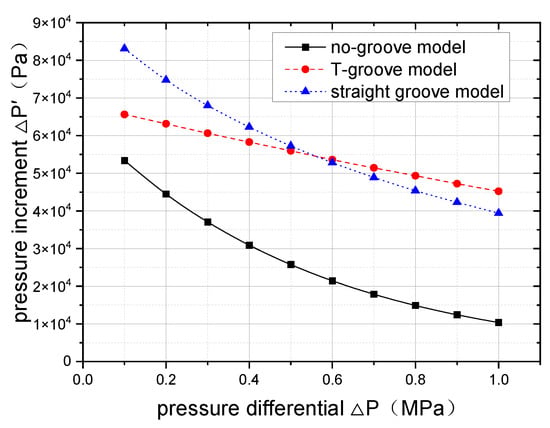 Figure 18 shows the variation in pressure increment with differential pressures for three types of grooves. The pressure increment is the difference between the gas film pressure and the pressure differential. When the pressure increment is used to analyze the impact of the pressure differential on the gas film pressure, the numerical misdirection caused by the pressure differential itself can be eliminated. For the T-groove CGFS, the pressure increment slowdown when the differential pressure is 0.1 MPa, the pressure increment of gas is 65,633 Pa, and when the differential pressure is 1.0 MPa, the pressure increment of gas is 45,229 Pa. The pressure increment has decreased by 31%. For the CGFSs with a straight groove, when the differential pressure increases from 0.1 MPa to 1.0 MPa, the gas pressure increment decreases by 53%. Compared with the T-groove, the gas film pressure increment of the straight groove decreases more rapidly. The gas film pressure increment of the no-groove model is similar to that of the straight groove. This indicates that for CGFSs, the enhancement effect of differential pressure on fluid dynamic pressure weakens with an increase in pressure differential.