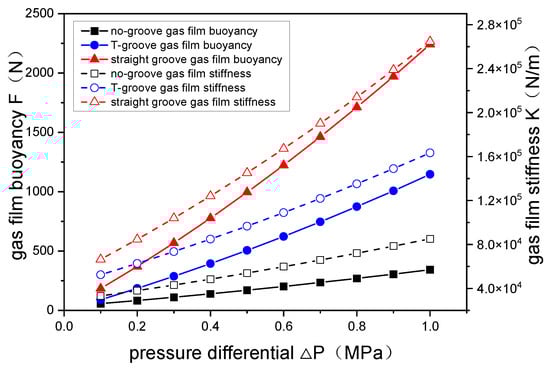 The change law of gas film buoyancy and stiffness with pressure differential.