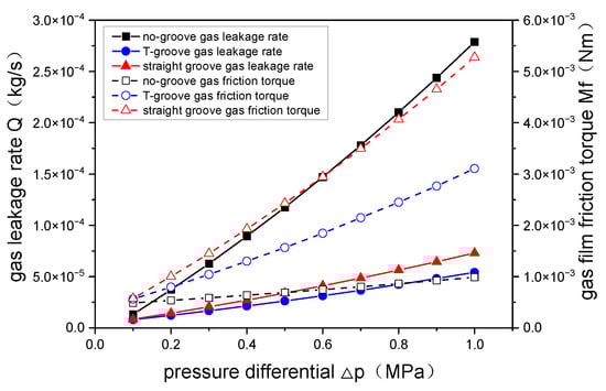 Figure 20 shows the change curve of gas leakage rate and gas film friction torque with pressure differential. The rotational speed is set to 28,000 rpm. The gas leakage rate of the three grooved models increases with an increase in pressure differential. The gas leakage rate of the no-groove remains the highest during the process, while the gas leakage rate of the two grooved models is low, and the change trend is similar. The gas leakage rate of the straight groove is greater than that of the T-groove because as the pressure differential increases, the amount of gas flowing into the gap rises, and the gas flow direction mainly flows along the axial line, resulting in an increase in leakage rate. The gas leakage rate of the two grooved models is significantly lower than that of the no-groove model, with the two-stage dam of the T-groove having a noticeable effect on reducing gas leakage. The friction torque of the three types of grooves increases with an increase in pressure differential; the straight groove growth rate is the highest, followed by the T-groove, while the growth of the no-groove gas film friction torque is slow. Due to the low viscosity of gas, the friction torque of gas is small.