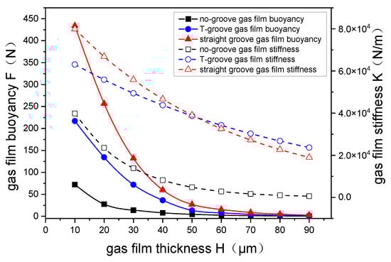 The change law of gas film buoyancy and stiffness with gas film thickness.