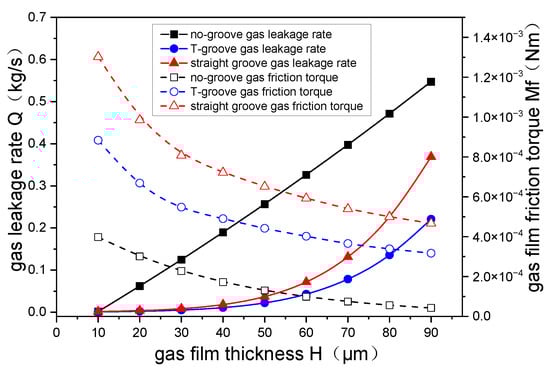 Figure 22 shows the variation curve of gas leakage rate and gas film friction torque with film thickness. We can see that the leakage rate of the three film models increases with an increase in film thickness, and the no-groove gas film increases approximately linearly. The gas leakage rate of straight grooves is slightly higher than T-grooves because when the film thickness increases, the gas gap expands, and the hydrodynamic effects decrease or even disappear, resulting in a flow rate increase in the leakage. The friction torque of different grooves decreases as the film thickness increases. The thickness of the gas film varies from 10 μm to 60 μm. The decrease rate of friction torque is the highest, with a 64% decrease in friction torque for the no-groove gas film. When the film thickness exceeds 60 μm, the decrease rate of friction torque gradually slows because when the film thickness increases, the flow channel expands, the hydrodynamic effects decrease, and the friction force between gas molecules decreases, resulting in a decrease in friction torque.