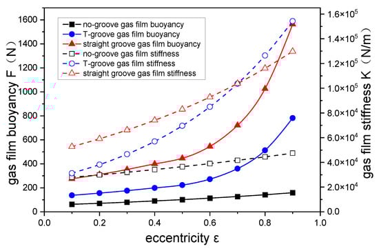To investigate the impact of eccentricity rate on flow field characteristics, we set the inlet pressure at 0.3 MPa, the outlet pressure at 0.1 MPa, the rotational speed at 2800 rpm, the film thickness at 10 μm, and the change range of eccentricity rate is 0.1~0.9. Figure 23 shows the variation curve of the gas buoyancy and gas film stiffness with eccentricity rate. As the eccentricity rate increases, the gas buoyancy of the straight groove and T-groove increases rapidly, while the buoyancy of the no-groove model slowly increases. The eccentricity rate has a significant impact on the gas buoyancy because the larger the eccentricity rate, the smaller the minimum gap, and the greater the overall hydrodynamic effects formed by the dynamic pressure grooves and eccentric wedge. As the eccentricity rate increases, the difference in gas buoyancy between the two grooved gas films becomes more apparent, and the gas buoyancy of the straight groove is greater than that of the T-groove. We can also see that the film stiffness of the three models increases with an increase in eccentricity rate. The film stiffness of the no-groove increases and is smaller than that of the other two models since the film stiffness of the T-groove and the straight groove increases rapidly. As the eccentricity rate increases, the two-stage weir area of the T-groove has an obvious effect on improving the hydrodynamic action, greatly improving gas stability.