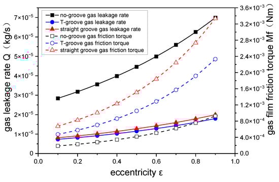 Figure 24 shows the change curve of gas leakage rate and gas film friction torque with eccentricity rate. As the eccentricity rate increases, the leakage rates of all three models show an upward trend. The gas leakage rate of the no-groove model is faster than those of the other two grooved models. The main reason is that as the eccentricity rate increases, the distribution of the gas becomes more non-uniform, and the gas flow at the position with the maximum gas film thickness will sharply increase, resulting in a significant increase in the overall leakage. The friction torques of all three groove models increase with an increase in eccentricity rate. This is because as the eccentricity increases, although the friction torque at the small film thickness increases, the friction torque at the largest film thickness decreases, and the overall friction torque shows an upward trend.