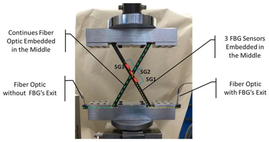 To evaluate the use of embedded FOS as mechanical strain sensors, a simple 4-point bending test was adopted (Figure 5). In this case, the position of FBG #3 corresponded just to the center of the rib segment (the middle of the load span), whereas the other two sensors were placed in a region of rigid body displacement (i.e., zero strain). As per the other cases, the optical fiber was aligned to the carbon fiber tows and placed very close to the midplane of the rib, but not exactly in the neutral plane. In this way, the sensors could experience alternatively tensile and compressive strain by turning upside down the coupon in the test fixture. Consistently, only one sensor detected the strain during the cycles of loading and unloading of the coupon, whereas the other two sensors recorded only flat curves (Figure 6).