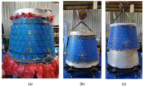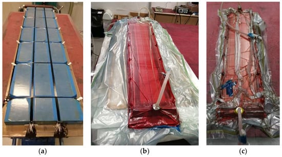 (a) Ortho-grid panel after deposition of interlaced dry tows; (b) Vacuum bag preparation for resin infusion; (c) Test article after the cure process in the oven.