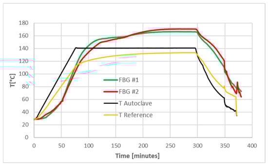 The application of FOS as temperature sensors embedded inside the ribs was very useful to address the final selection of the resin. In fact, the sensors were able to log the real temperature history which developed during the cure cycle. As a consequence of the high heat of reaction of the resin initially selected, the temperature of the part exhibited an overshooting of the nominal cure temperature of about 30° (Figure 7). This fact reflected, in particular, the situation occurring in the inner part of the cross-section of the rib where the FBGs were located. This part, indeed, is relatively thermally insulated by the rubber carpet surrounding the bottom and the two sides of the cross-section of the rib (other than by the thickness of the rib itself through which the heat mainly flows). Due to the higher thermal resistance of this inner part, the temperature increase rate, initially, is lower than the increase rate of the reference temperature (the yellow curve). Then, after about 50 min, as recorded by the FBGs, there is a change in the slope of the temperature curves which indicates the beginning of the exothermal reaction of the cure kinetic. In this case, due to the same high thermal resistance of the part, the heat produced during the cure reaction is hardly dispersed through the thickness of the rib and the rubber carpet, and a sort of exponential curve is consequently generated.