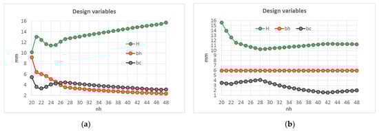 Examples of optimal design variables vs. the number of helical ribs (nh): (a) without manufacturing constraints; (b) with the manufacturing constraint bh = 6.0 mm.