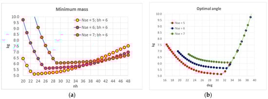 (a) Minimum mass solutions vs. the number of helical ribs (nh) and the number of hoop sections (Nse); (b) Helical angle values at the large radius of the cone.