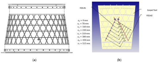 Ortho-grid panels were manually fabricated by dry tows and resin infusion under the vacuum bag (Figure 3). Two main longitudinal elements are interlaced with six transverse elements which represent generic helical and hoop ribs, respectively. The aim of these articles was twofold: (1) to address the CFRP material selection of the demonstrator, and (2) to achieve a preliminary feasibility demonstration of embedded FOS in the real process condition. Indeed, the production of such panels provides on a small-scale level some relevant similarities with the final manufacturing process, that is: (1) the fiber volumetric fraction of the ribs, which is essential to obtain the same basic stiffness and strength properties, and (2) the general behavior of the resin, which is essential to evaluate its reliability in view of the infusion and cure process (e.g., in terms of viscosity and heat of the reaction).