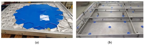 (a) Casting of the rubber carpet (one sector); (b) Cover with holes to squeeze the excess of rubber.