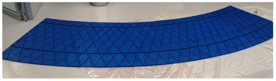 A phase of the liquid rubber casting for the carpet (one sector) is shown in Figure 15. The mold features straight segments for helical ribs and curved elements for hoop and end rings, reproducing the complete pattern of the grid structure (manufacturing model). Dummy inserts were also added to shape the cavities for the insertion of the mechanical interfaces necessary for the integration of fiber optics at half the rib thickness. The five sectors were finally joined to obtain the full carpet as shown in Figure 16.