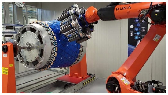 The winding of the carbon dry preform was conducted by means of the robotic cell system available at CIRA (Figure 17). The system is capable of very effectively producing the fully interlaced preform according to the approach named “Parallel Winding” [12]. This cell encompasses the foregoing experience in the manufacturing of CFRP grid structures and is composed of a positioner which rotates the metallic mandrel, a creel which supports the spools for the winding of hoop ribs and the robot with a customized deposition head handling up to 8 spools for the winding of helical ribs under controlled tension. The conical mandrel includes peripheral pins that are necessary for the winding of helical ribs and other pins to secure the rubber carpet. After the planning of the winding strategy and the subsequent refinements of the winding trajectories, the robotic cell worked very efficiently and precisely. Indeed, the system is capable of laying down one layer of the carbon dry preform in only 20 min.