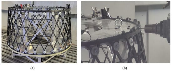 After demolding, the structure was secured by a rigid frame and trimmed with the aid of a CNC machine to achieve the net shape of the demonstrator (Figure 21). The final result was a grid structure with the highest quality, perfectly infused, with a nominal size of ribs and with embedded FOS properly working (Figure 22). The demonstrator weighs 7.2 kg, that is, 1 kg less than the mass target and 30% less than the reference solution.