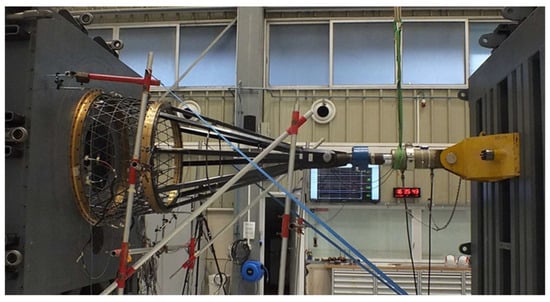 Overall, all the tests were successfully conducted, the structural behavior was nicely correlated by detailed stress–strain analysis, including the correlation with the buckling mode captured by the high-speed camera and manifested by the cone just a few instants before the collapse (Figure 29). A kind of mixed buckling mode can be seen which involves both radial and in-plane displacements of the ribs, the latter being more evident in the case of hoop ribs.