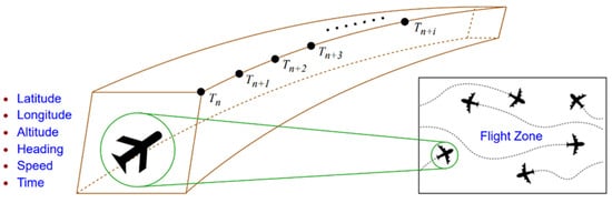 It is assumed that a flight area consists of multiple aircraft flying within their designated air corridors. Given the GPS data of the aircraft at a specific time Tn, including latitude, longitude, altitude, heading, speed, and time, a model can be developed to predict the data for the subsequent i intervals []. This sequential trajectory prediction within an air corridor is shown in Figure 1.