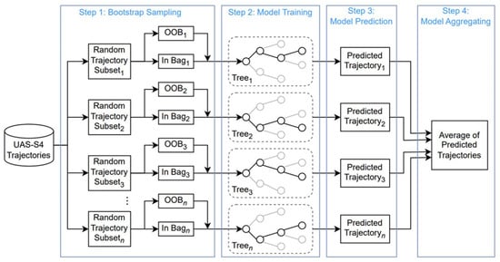 Firstly, trajectory dataset containing the UAS-S4 GPS data provides n trajectory samples for the RF model. These samples are transmitted to the ‘In-Bag’ and ‘Out-of-Bag’ blocks in parallel. The ‘In-Bag’ block provides a subset of training samples used to train a particular decision tree within the ensemble. The ‘Out-of-Bag’ block gathers samples as a subset of training data that are not used during the training of a specific decision tree within the ensemble. Relying on the ‘In-Bag’ and ‘Out-of-Bag’ blocks, the bootstrap sampling process is executed. In this bootstrap sampling, samples are randomly selected and replaced in the original dataset to create a new dataset of equivalent size. On average, approximately 63.3% of the unique instances from the original dataset are selected at least once in this process (known as ‘In-Bag’ samples). The remaining 36.7% that are not selected constitute the OOB samples for that specific tree. Samples are then sent to the trees as a unique regressor and have a particular architecture. Trees are trained, and each makes trajectory predictions based on its individual learning. Predicted trajectories are collected, and their average is considered as the most representative value.