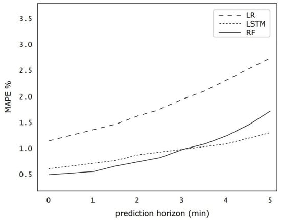 In Figure 4, MAPE values are depicted for the LR, LSTM, and RF models used for trajectory prediction. The LSTM and LR models are those of the designed models in our previous study []. Each model was assessed within a prediction horizon spanning 5 min. The LR model could never surpass the performance levels exhibited by its counterparts, LSTM and RF, and its lowest MAPE (1.19%) was achieved for the immediate prediction. The error was computed based on measuring Euclidean distance. Since, for specific altitudes, UAS-S4s were arranged in a 16 km2 flight zone, and each sector was 100 m × 100 m, 1% error could be 1.4 m at max [].