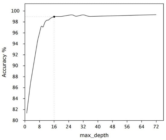 ‘max_depth’ is a crucial hyperparameter used in the RF model and other tree-based algorithms such as decision trees and gradient boosting trees. The ‘max_depth’ parameter specifies the maximum depth of each tree in the Random Forest. The depth of a tree is the maximum distance from the root node to any leaf node. This hyperparameter is supposed to control overfitting, model complexity, and training time. By limiting the depth of the trees, the model can avoid fitting too closely to the training data, thus helping to mitigate overfitting. Deeper trees can model more complex patterns, but they may also capture noise in the data. Shallower trees can generally train the model faster than the deeper trees because there are fewer computations to perform. Figure 6 illustrates the RF accuracy for a variety of ‘max_depth’ values. Setting an appropriate ‘max_depth’ helps manage the trade-off between model complexity and overfitting.