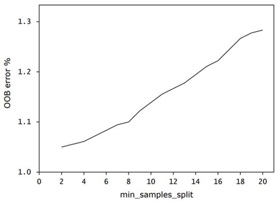 A very deep tree might capture noise in the data and overfit, while a very shallow tree might not be able to capture the underlying patterns, resulting in underfitting. Other regularization hyperparameters in tandem with ‘max_depth’, such as ‘min_samples_split’ and ‘min_samples_leaf’, can be considered. These hyperparameters were involved in the proposed RF trajectory prediction model. They help to control the growth of the trees and, consequently, affect the model performance and complexity. ‘min_samples_split’ defines the minimum number of samples required to split an internal node. Figure 7 shows the OOB error obtained in % for various ‘min_samples_split’ values.