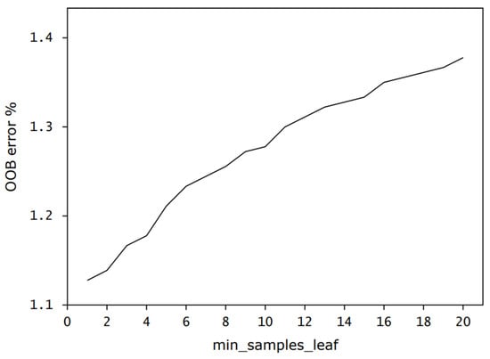 The other pivotal hyperparameter is ‘min_samples_leaf’, which specifies the minimum number of samples required at a leaf node. Setting this to a high value creates a constraint on refining the partitions, which smoothens the model and avoids overfitting. With a larger number of samples in the leaf, the model becomes more robust to noise in the data. Figure 8 shows the RF model performance in terms of OOB error with increasing ‘min_samples_leaf’.